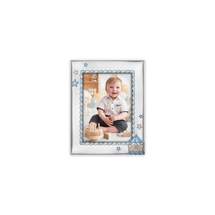 Le cadre Federico Bleu, plaqué argent et conçu pour des photos 10×15 cm, est orné d’oursons bleus et de motifs de cirque. Sa finition brillante et son dos en bois offrent un style à la fois élégant et tendre, idéal pour une photo de bébé ou un cadeau de naissance.