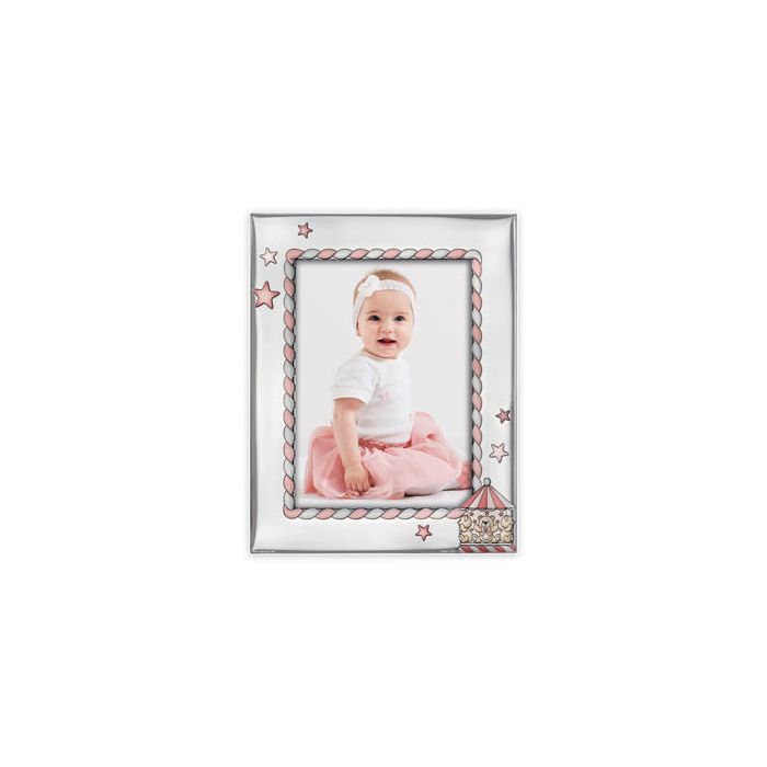 Le cadre Federico Rose, plaqué argent et conçu pour des photos 10×15 cm, est orné d’oursons roses, d’étoiles et de motifs de cirque. Sa finition brillante et son dos en bois offrent un style élégant et tendre, idéal pour une photo de bébé ou un cadeau de naissance
