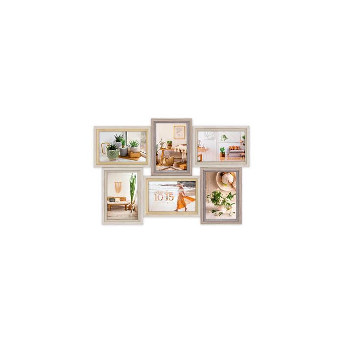 Découvrez le charme polyvalent du Cadre photo Zep VZ662 Zara 6Q 6x10x15 cm, idéal pour mettre en valeur vos 6 photos préférées. Cette élégante composition photo accueille 6 images de 10x15 cm chacune, apportant une touche raffinée à votre intérieur ou bureau. Le cadre en bois, avec son alliance unique de blanc, marron et gris, ainsi que son profil carré bicolore, sublime chaque mur où vous le fixez. Ses dimensions de 31,5 x 46 cm (Lxl) en font un élément décoratif qui attire le regard dans tout espace.