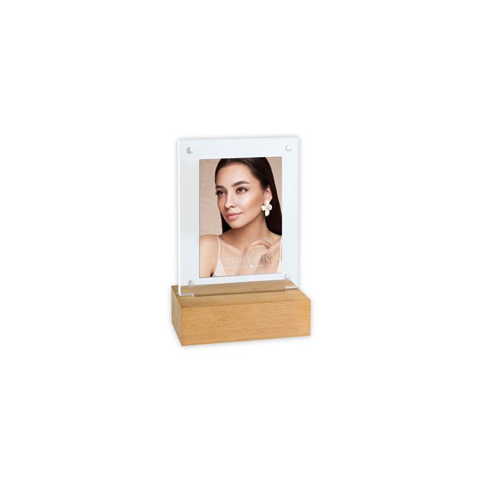 Le cadre New York N Acrylique Vertical, conçu pour des photos 10×15 cm, associe plaques en acrylique, base en bois naturel et éclairage LED. Présentation double face et changement rapide grâce à la fermeture magnétique.