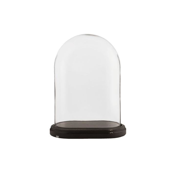 Fabriquée en verre transparent de haute qualité et dotée d'une solide base en bois marron, la Clayre Eef Cloche 6GL1269 allie raffinement et durabilité. Sa forme ovale et ses dimensions généreuses de 26x15x34 cm offrent suffisamment de place pour des objets plus grands ou de forme unique, et en font un élément remarquable sur les tables, étagères ou cheminées.