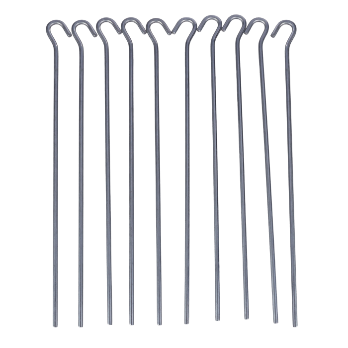 Piquets en acier de 30 cm offrant une excellente stabilité, même sur sol meuble ou par vent fort. Parfaits pour tentes, haubans et filets de camouflage. Livrés par lot de 10.
