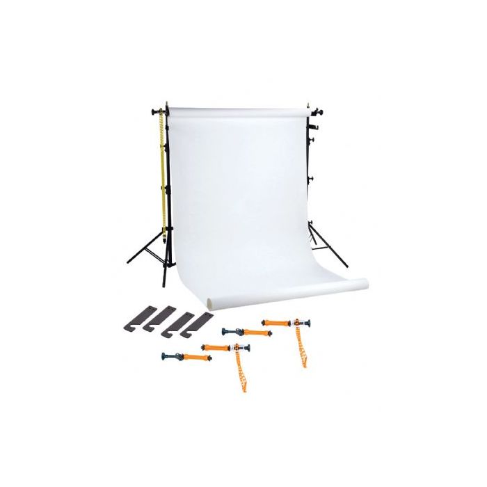 Cet ensemble de fond complet offre un système robuste et évolutif avec trépieds hauts, porte-rouleaux, chaînes et pinces CBH-5. Idéal pour utiliser rapidement et solidement plusieurs rouleaux en papier ou vinyle en studio.