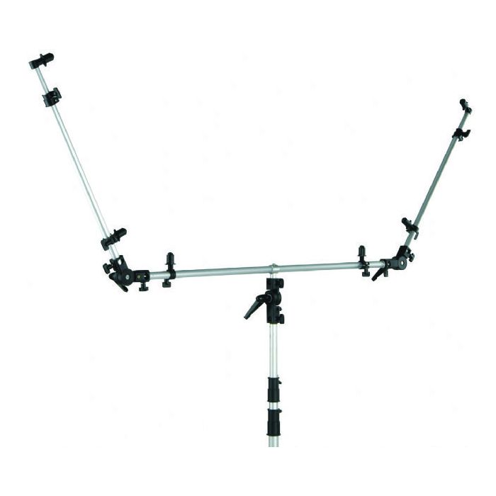 La traverse de ce support mesure 940 mm de long et présente un tube épais de 22 mm pour une grande solidité. Elle offre, de chaque côté, un support inclinable avec une mobilité impressionnante de 270 degrés. Les deux bras, tout aussi solides grâce à leur tube de 22 mm, se règlent en longueur de 55 cm minimum à 100 cm maximum.