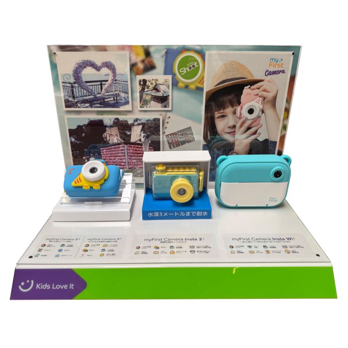 Le myFirst Display comprend tous les éléments visibles sur la photo, y compris les trois caméras factices. Son design soigné et ludique attire immédiatement le regard et met vos produits en avant. Une belle façon de faire briller votre collection myFirst !