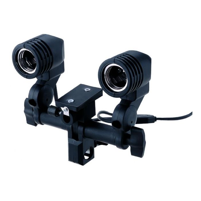 Découvrez la polyvalence du support universel StudioKing DLE27S, conçu pour enrichir vos besoins en éclairage. Ce support accueille deux lampes avec douille E27, vous permettant d’utiliser facilement différents flashs esclaves et lampes à lumière du jour pour un éclairage professionnel. Un trou intégré avec vis de serrage facilite la fixation d’un parapluie de flash, parfait pour créer une diffusion douce de la lumière. Vous pouvez fixer ce support en toute simplicité sur n'importe quel pied d’éclairage standard grâce à un adaptateur spigot, pour démarrer rapidement votre séance photo.