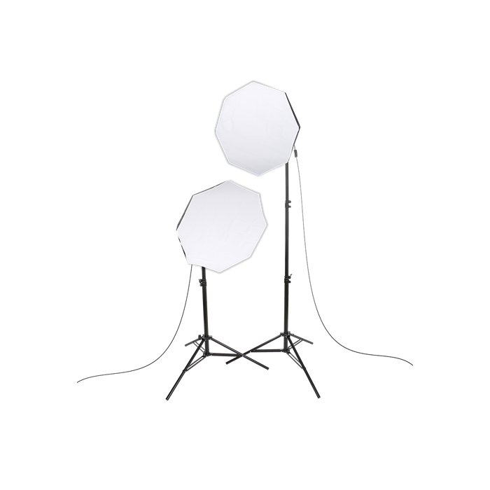 Le set de livraison comprend 2 octabox, 2 puissantes lampes spirales de 85W, 2 trépieds robustes, 2 diffuseurs et un sac de transport pratique pour un maximum de confort.